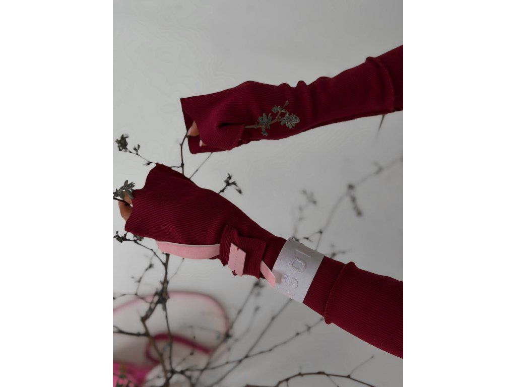 - zamatová ružová šnurka s kovovým štítkom na rukáve a prednej časti